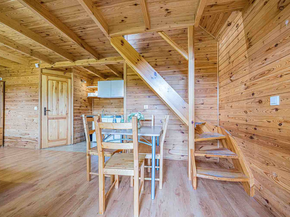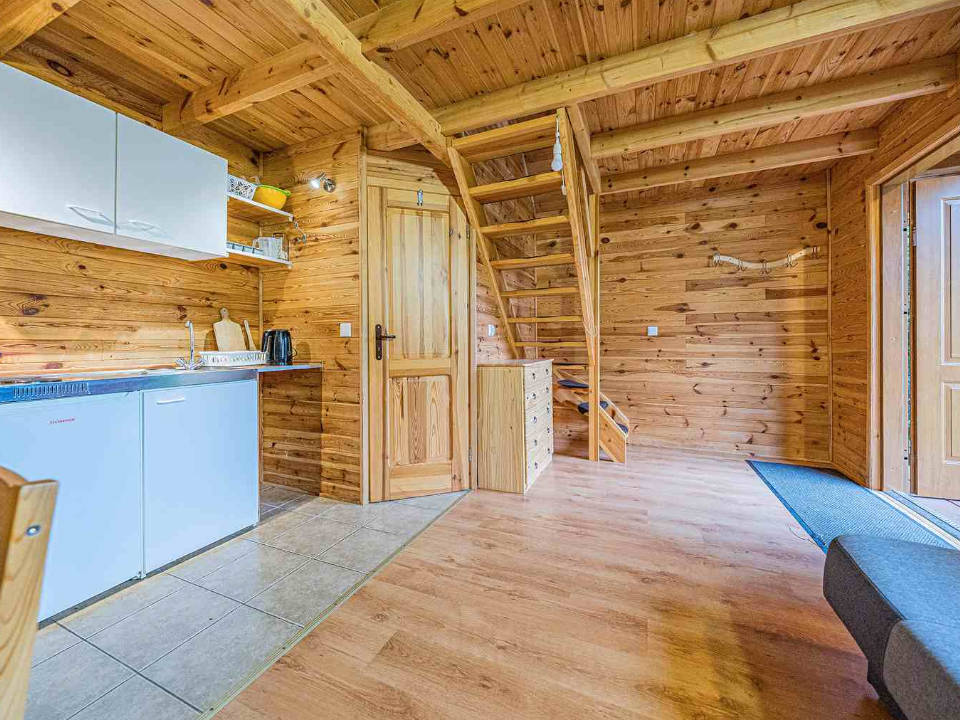 Domek o wysokim standardzie dla wymagających gości, posiadający sypialnię, łazienkę z wanną i kuchnię.